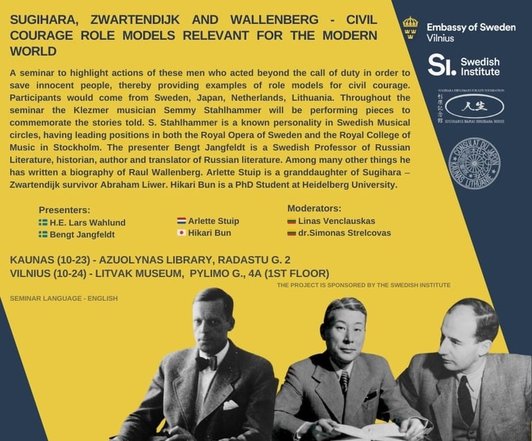 On 23-24 October 2024, Kaunas and Vilnius will host exclusive conferences "Sugihara, Zwartendijk and Wallenberg - civil courage role models relevant for the modern world" organised by the Sugihara House Museum and the Embassy of Sweden to highlight the extraordinary role models of civic courage and humanity of three diplomats - Chiune Sugihara, Jan Zwartendijk and Raoul Wallenberg. The event will not only recall the lessons of history, but also stimulate debate on how the examples of these heroic figures can inspire us in today's world.